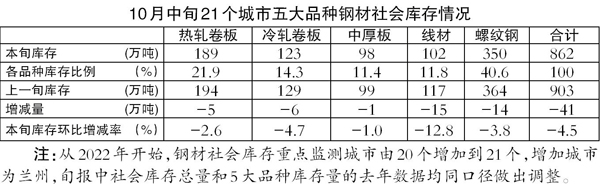 10月中旬,21個城市五大品種鋼材社會庫存為862萬噸,環(huán)比減少41萬噸,下降4.5%,庫存由升轉(zhuǎn)降;比今年初增加74萬噸,上升9.4%;比去年同期減少180萬噸,下降17.2%。